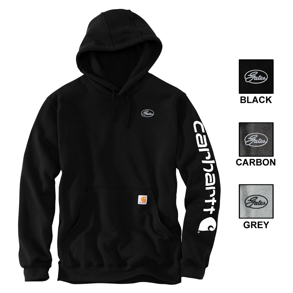 Show your Carhartt pride in this versatile, layerable sweatshirt that features a bold Carhartt signature logo down the left sleeve. 10.5-ounce, 50/50 cotton/poly blend or 59/41 cotton/poly blend (Black, Carbon Heather, Carhartt Brown, New Navy)* 70/30 cotton/poly blend (Heather Grey). Attached three-piece hood with drawcord closure. Carhartt signature logo down left sleeve. Front hand warmer pocket. Stretchable, spandex-reinforced, rib knit cuffs and waistband. Carhartt-strong, triple-stitched main seams for added durability. Carhartt patch sewn on handwarmer pocket. Loose fit.